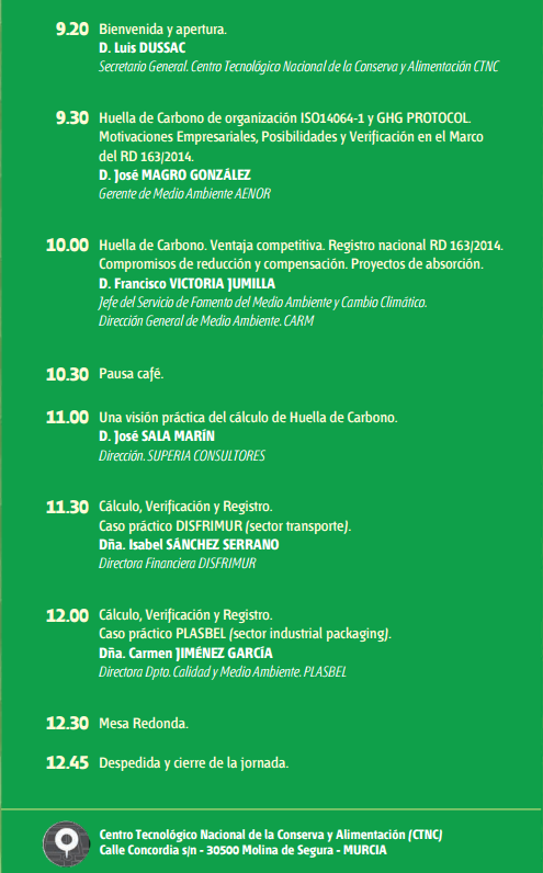 El próximo jueves 12 de marzo se celebrará, en el Centro Tecnológico Nacional de la Conserva un desayuno de trabajo sobre la Huella de carbono en la Industria Alimentaria organizado por AENOR en el que participará el director de Superia Consultores D. José Sala Marín aportando una visión práctica del cálculo de la huella de carbono.